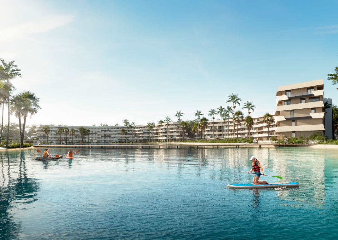 Amenidades: piscina, spa y wellness, lobby, sport bar, restaurante, lago para actividades acuáticas, casa club, áreas deportivas y recreativas, parque para mascotas, zonas infantiles y senior, zona comercial, zonas gastronómicas, senderos peatonales y Club de playa privado.